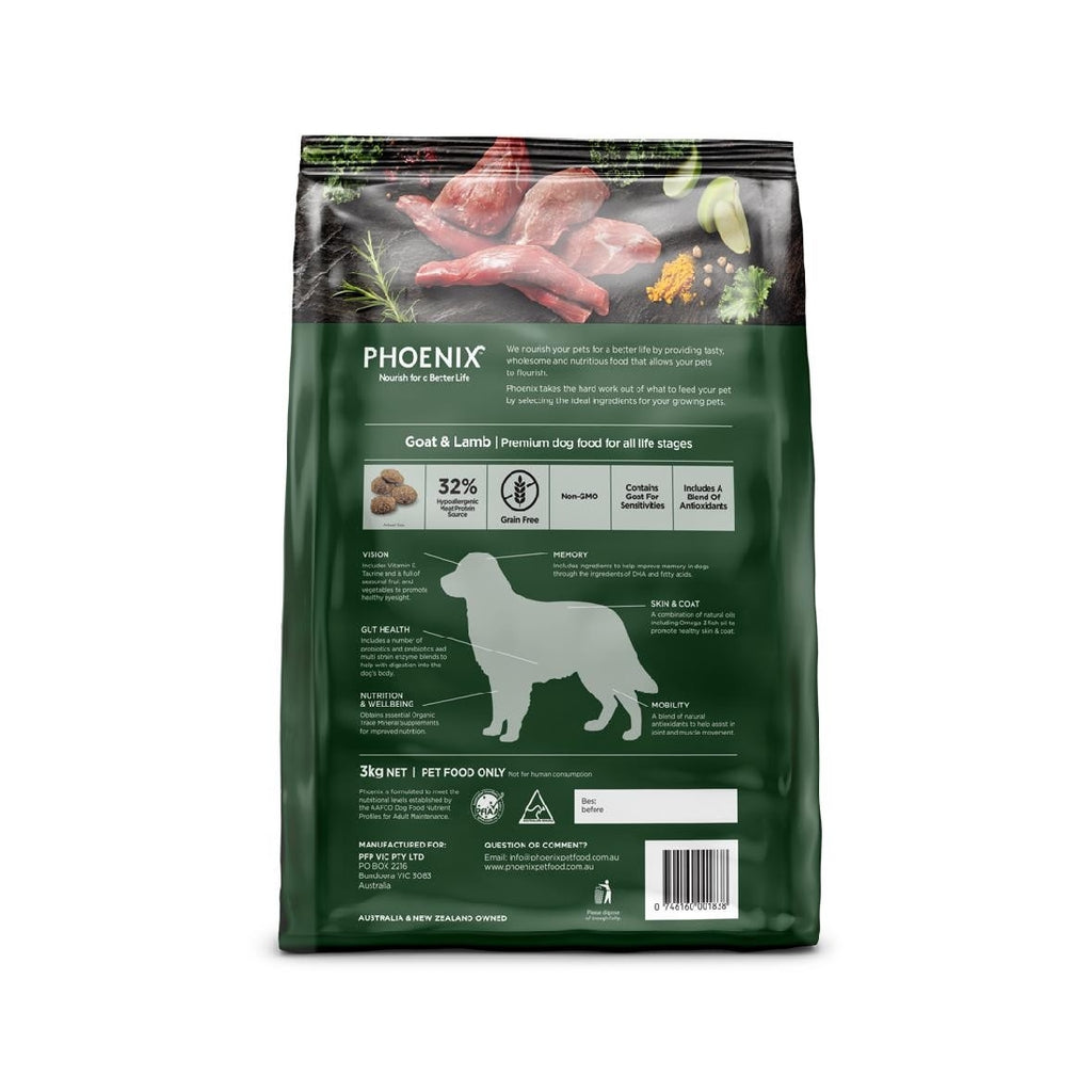 Phoenix selects high quality ingredients that allow pets to flourish. Rich in taurine and other carefully selected ingredients, the locally sourced Goat & Lamb recipe supports your dog's memory, vision and other cognitive functions. This higher protein diet promotes healthy coat and joints through precise intergration of omega-3 and omega-6 blends, specifically formulated for dogs with sensitivities. With superfoods such as coconut, kale and blueberries, these recipes are high in minerals, vitamins and antioxidants - providing your dog with a complete balanced diet. Carefully selected fruits and vegetables, combined with natural prebiotics and probiotics that promote healthy digestive activity, results in more nutritious food inside your dog (and less in your backyard). This recipe is grain free and contains no artificial colours, flavours or preservatives. It's suitable for all life stages and is available in 3kg and 13kg bags.